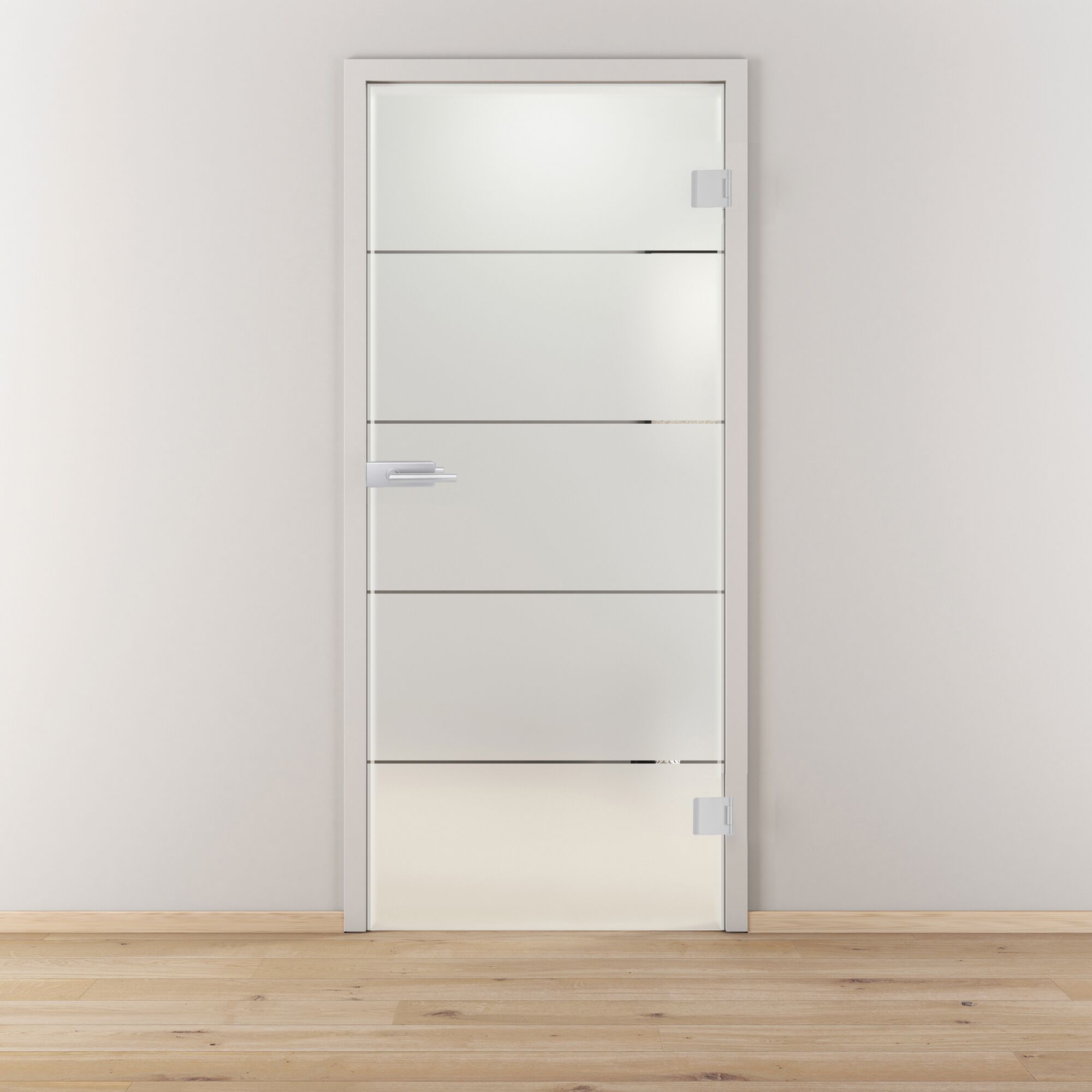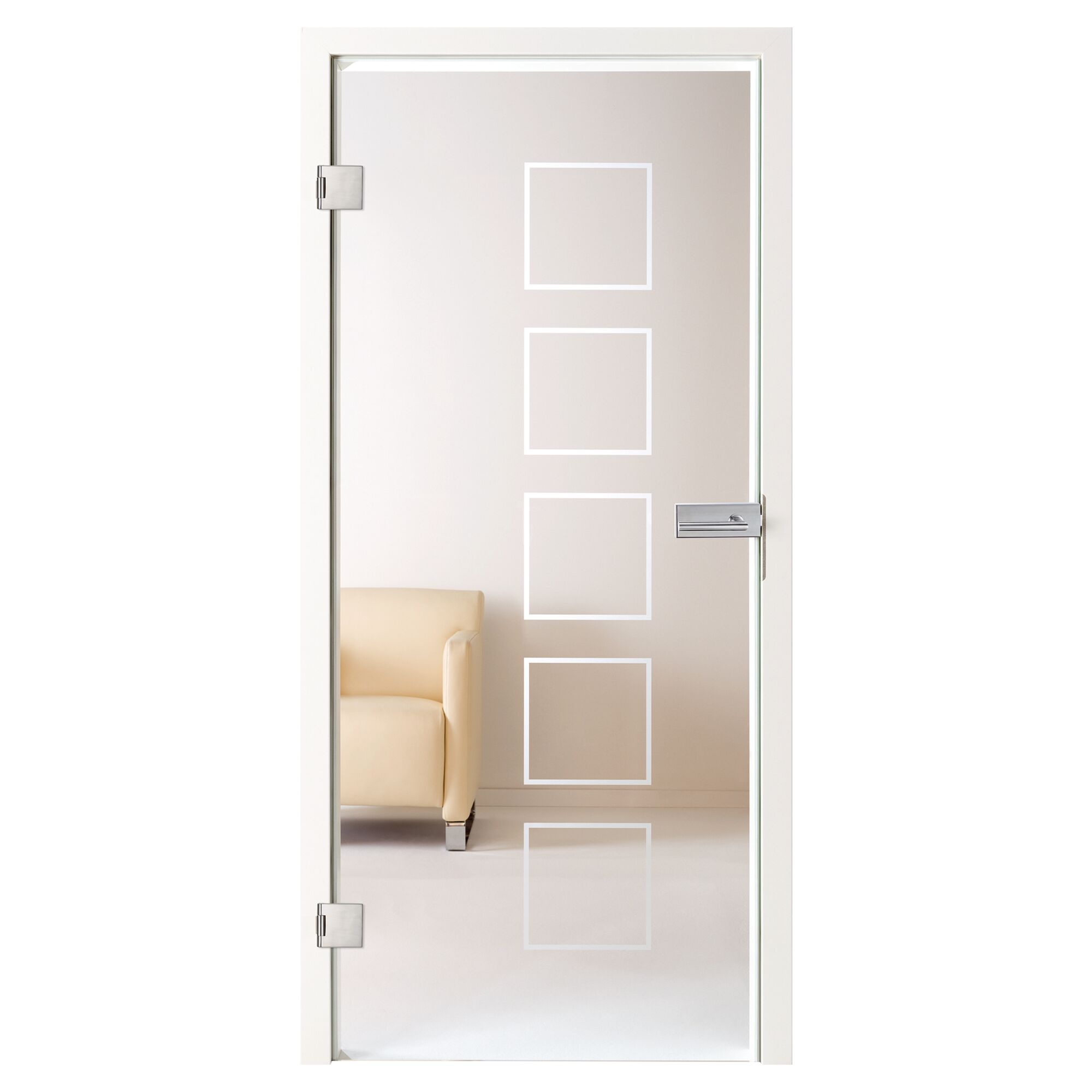 Neben Ganzglas bieten wir auch satiniertes (mattiertes) oder Glas mit Siebdruck an. So erhältst du eine Tür mit ansprechendem Muster, wie beispielsweise Streifen oder Vierecke.