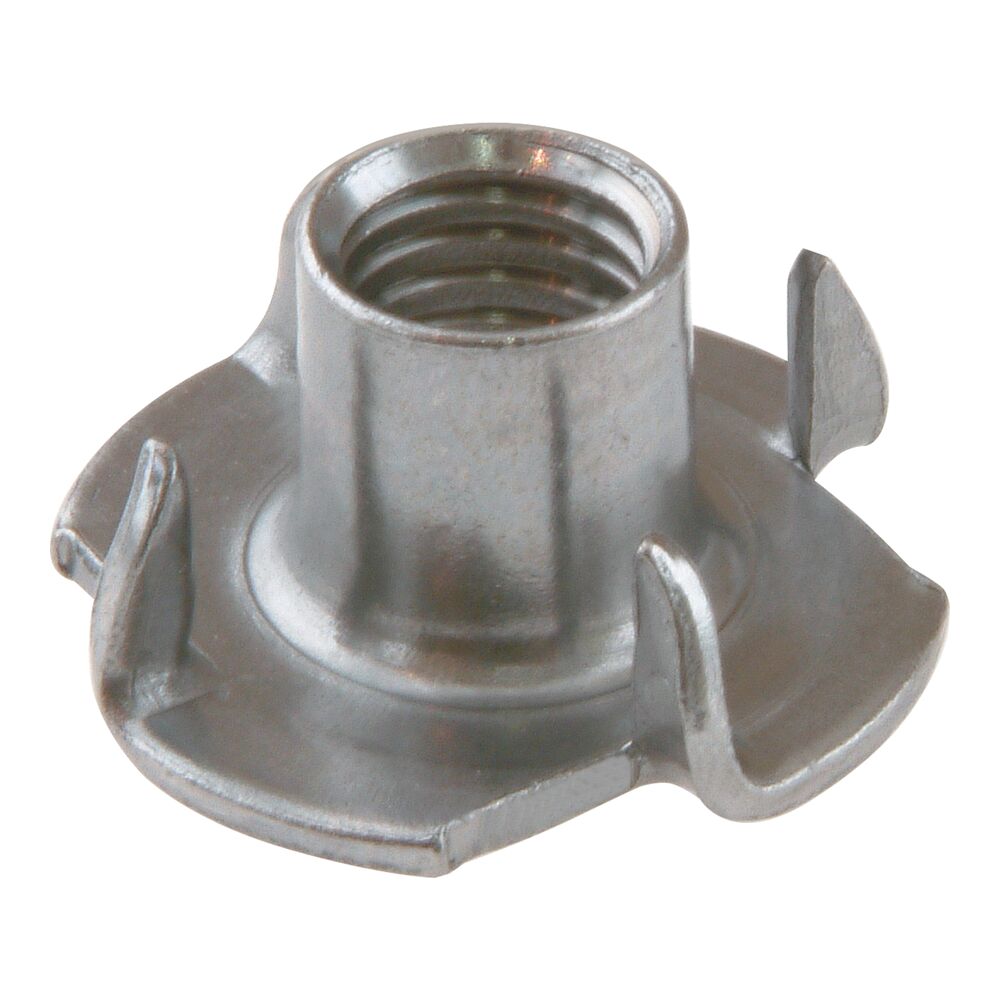 - Einschlagmutter: Um Schrauben schnell und stabil in Holzbretter einzulassen, bietet sich diese Variante mit einer verzahnten Oberseite an. Sie wird mit dem Hammer ins Holz geschlagen, wobei die kleinen Zähne verhindern, dass sich die Schraube später im Werkstoff verdreht.
